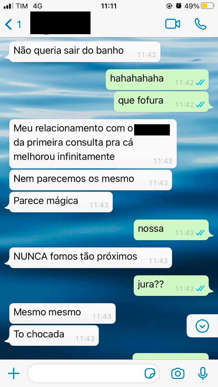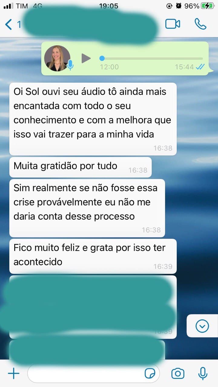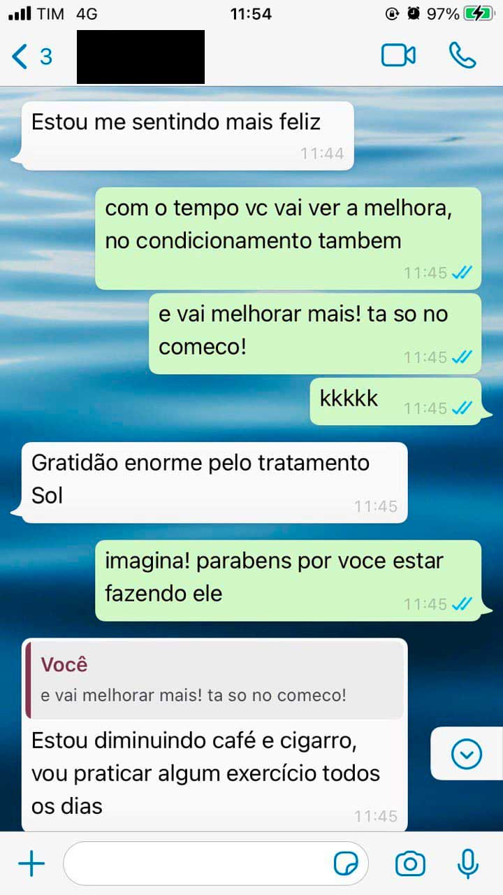 "Resolvi procurar a Sol pois estava gostando do conteúdo no Instagram, sentia que precisava de uma terapia alternativa e resolvi me abrir para conhecer o novo.